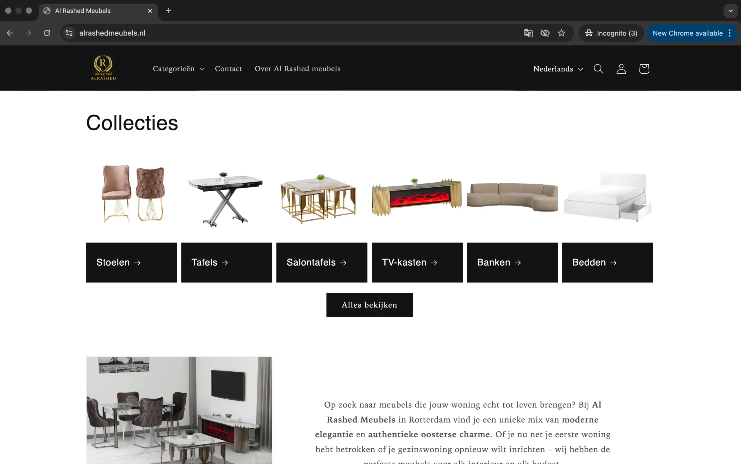De webshop vertelt het verhaal van Al Rashed Meubels – een merk dat staat voor vakmanschap, kwaliteit en persoonlijke service. Elk meubelstuk is met zorg geselecteerd en ontworpen om warmte en elegantie in huis te brengen.